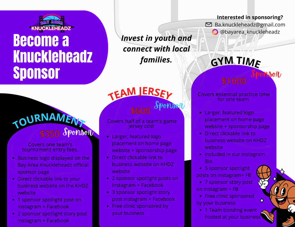 At Bay Area Knuckleheadz, we go beyond the game. We use basketball as a tool to mentor, guide, and uplift young athletes across our community. Your partnership helps provide training, gear, mentorship, and opportunities that many of our kids wouldn’t otherwise have access to.